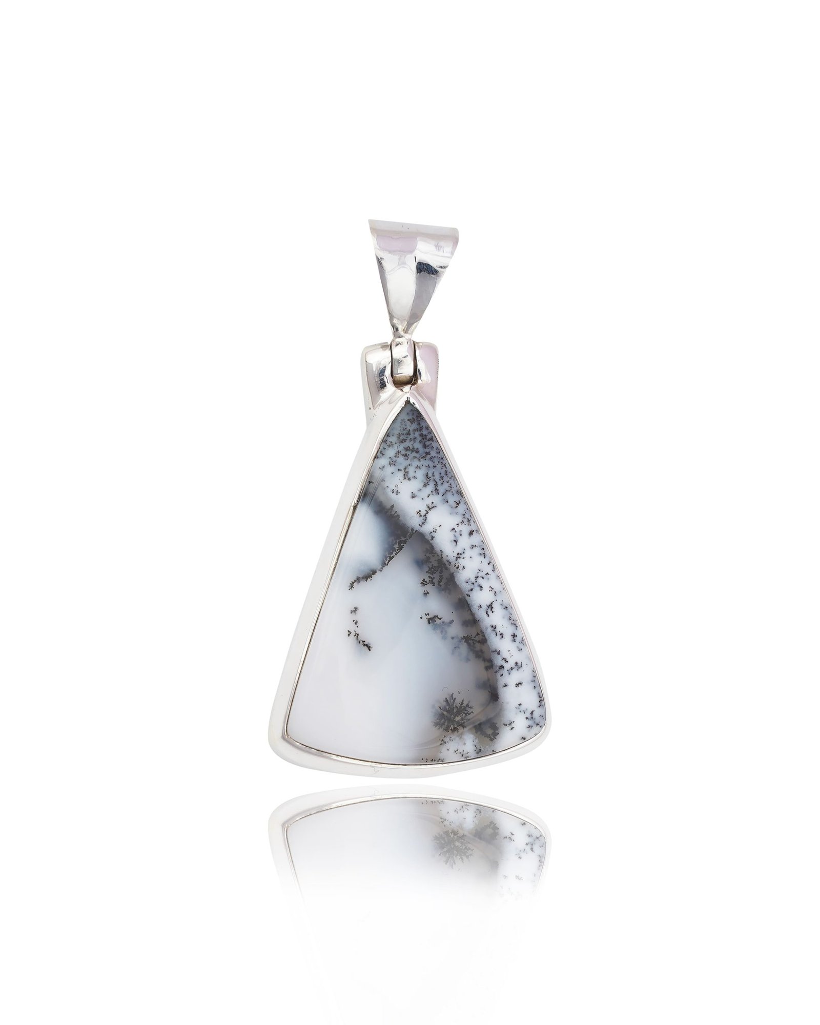 Dendritic Agate features unique tree-like patterns that give a glimpse into nature. These designs often look like ferns, trees, or landscapes and form through manganese or iron oxide deposits within the agate, making each piece of art one-of-a-kind. No two pendants are alike.