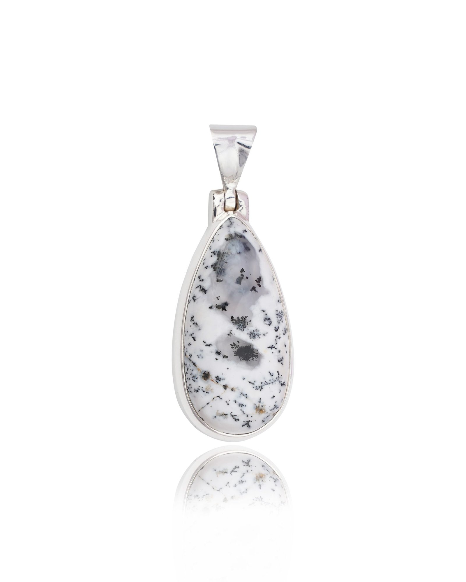 Dendritic Agate features unique tree-like patterns that give a glimpse into nature. These designs often look like ferns, trees, or landscapes and form through manganese or iron oxide deposits within the agate, making each piece of art one-of-a-kind. No two pendants are alike.