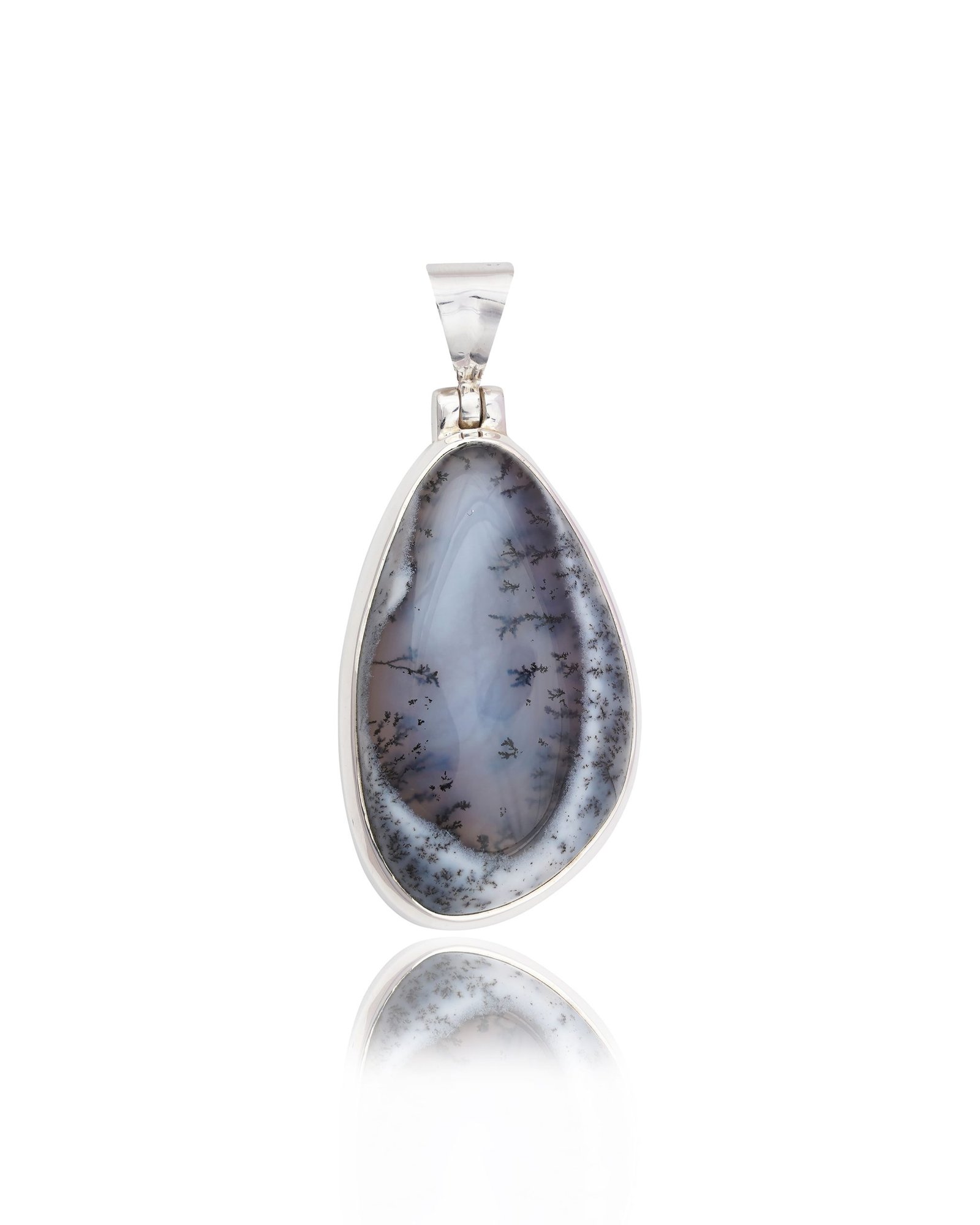 Dendritic Agate features unique tree-like patterns that give a glimpse into nature. These designs often look like ferns, trees, or landscapes and form through manganese or iron oxide deposits within the agate, making each piece of art one-of-a-kind. No two pendants are alike.