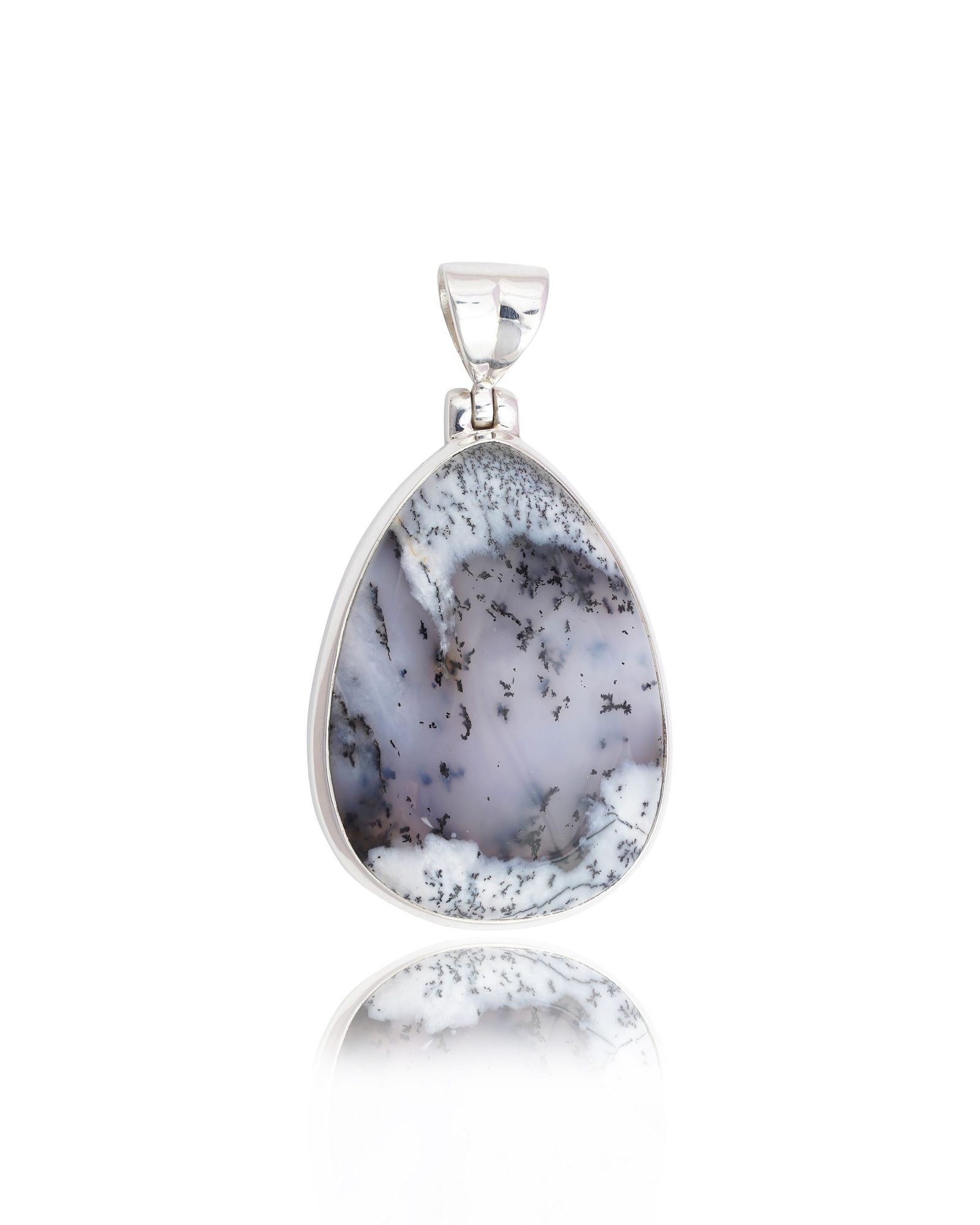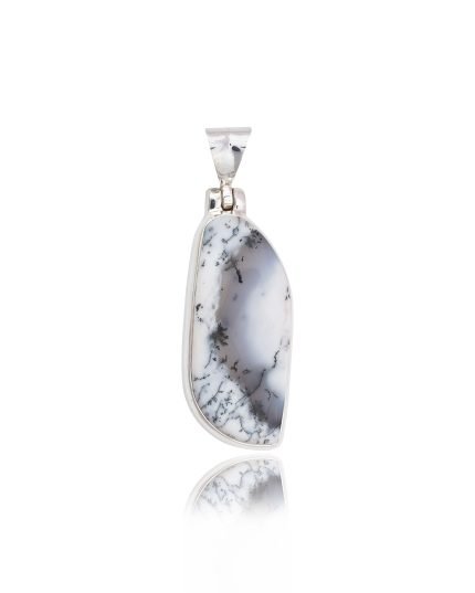 Dendritic Agate features unique tree-like patterns that give a glimpse into nature. These designs often look like ferns, trees, or landscapes and form through manganese or iron oxide deposits within the agate, making each piece of art one-of-a-kind. No two pendants are alike.