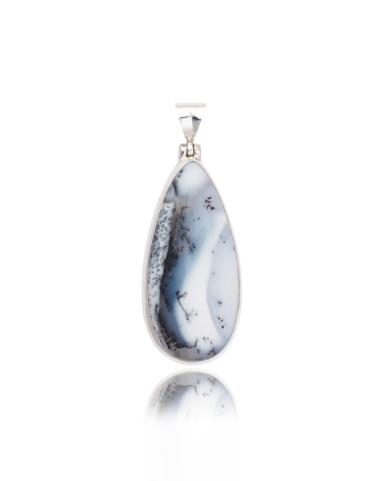 Dendritic Agate features unique tree-like patterns that give a glimpse into nature. These designs often look like ferns, trees, or landscapes and form through manganese or iron oxide deposits within the agate, making each piece of art one-of-a-kind. No two pendants are alike.